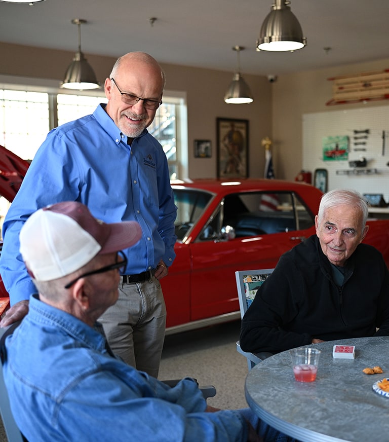 Our classic car garage, vintage activity kitchen, and on-site equine therapy program provide residents with engaging and familiar experiences.
